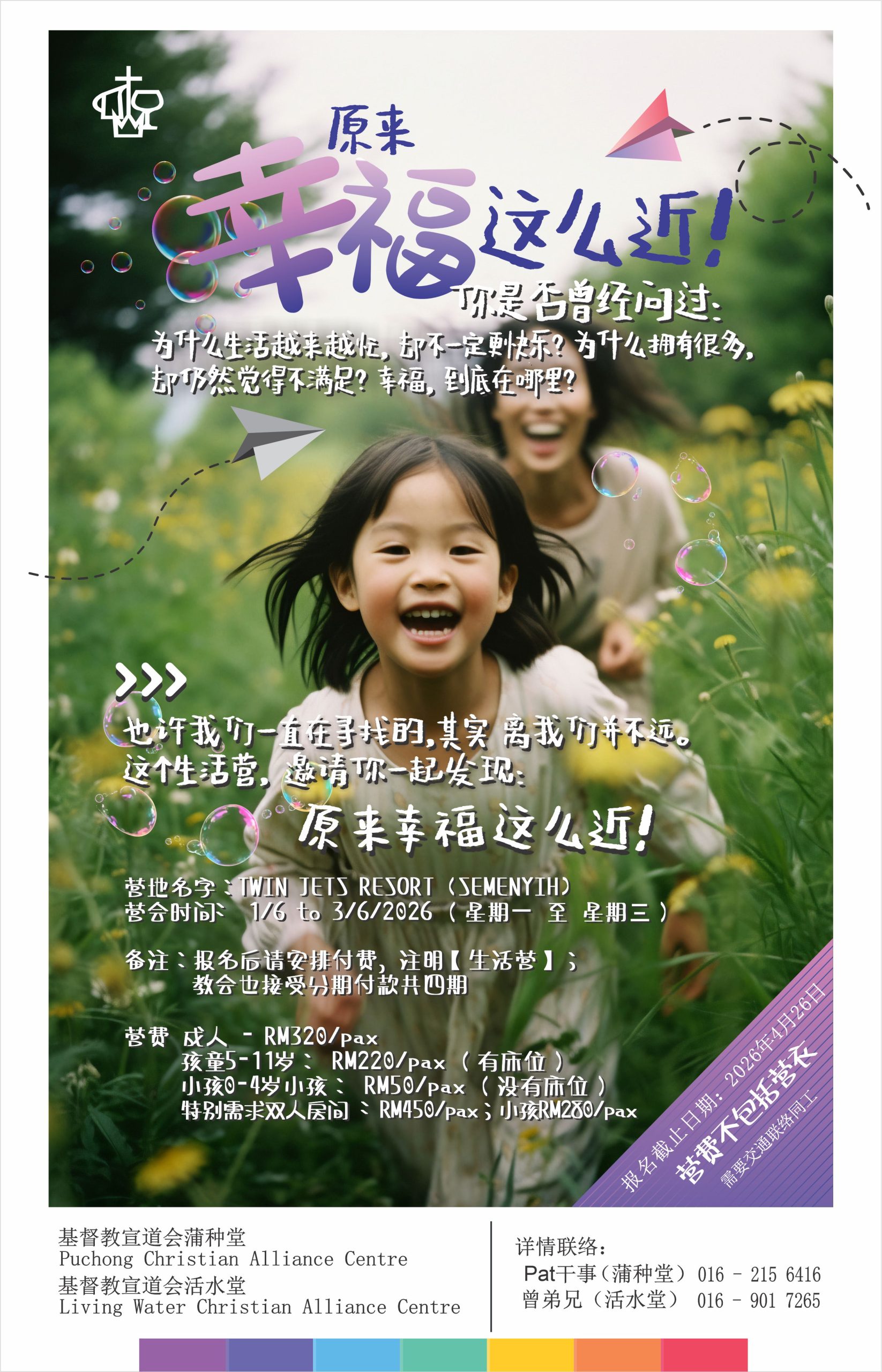 - 2026年生活营预告* 将于2026年6月1~3日(星期一到三)在士毛月的Twin Jets Resort举行,主题为《原来幸福这么近!》。这次的营会不仅要促进弟兄姐妹的团契,也是一个福音性质的营会,鼓励弟兄姐妹邀请未信主的亲戚朋友参加。6月1日和6月2日分别为最高元首华诞和卫塞节(补假)公共节期,参加者只需申请一天(6月3日)年假。请弟兄姐妹请尽快透过这个衔接报名,截止日期为4月26日。详情参阅如下海报或联络Pat干事。报名费: