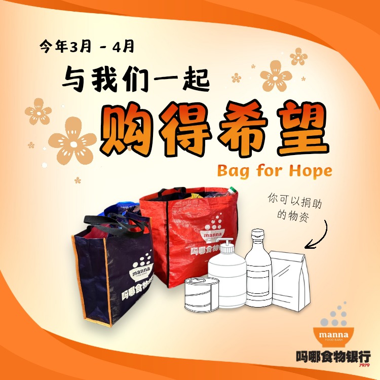 - 购得希望 | Bag for Hope* 让我们来为有需要的家庭购得一份希望;指定物资为:2kg 巧克力粉(Milo、Ovaltine、Vico等)/ 2kg 食用油 / 425g 罐头黄豆 / 900ml 洗碗液——牌子和数量不拘。有感动参与的弟兄姐妹从即日起把以上的物资送来教会。截止日期为3月29日(下主日)。所有的物资将透过全人关怀团队7979“吗哪食物银行”,送到需要的人手中。详情联络Pat干事。