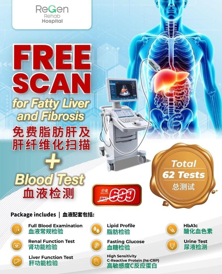 - 健康检查活动通知* ReGen医院现在为蒲种堂会友提供免费脂肪肝扫描及血液检查(此配套价值 RM699)。检验项目包括脂肪肝及肝纤维化扫描 + 血液检查(共 62 项),例如:脂肪肝及肝纤维化扫描;血液常规检验(Full Blood Examination);肝功能、肾功能检验;血糖检验、糖化血色素 (HbA1c);高敏感C反应蛋白(hs-CRP);尿液检测等。